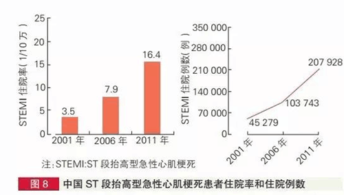 (5)ChinaPEACE研究对2001年——2011年间13815例ST段抬高型急性心肌梗死(STEMI)患者分析,结果显示:2001年——2011年因STEMI住院率逐年上升(图8);